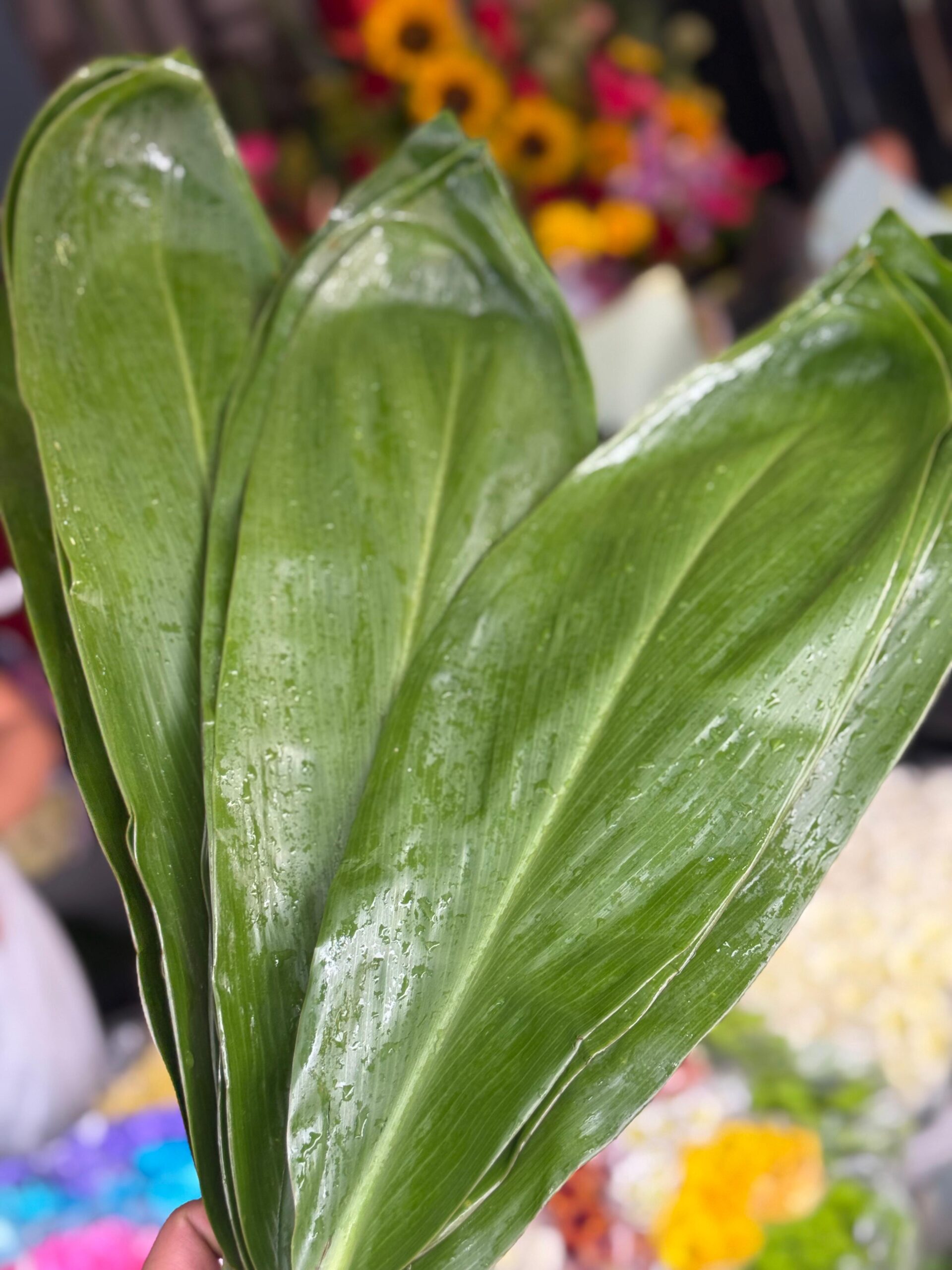 Sus hojas son grandes, anchas y poseen un brillo natural que las hace destacar inmediatamente. Este verde profundo y lustroso aporta una sensación de lujo y contemporaneidad , ideal para marcar una o pocas flores de impacto.
