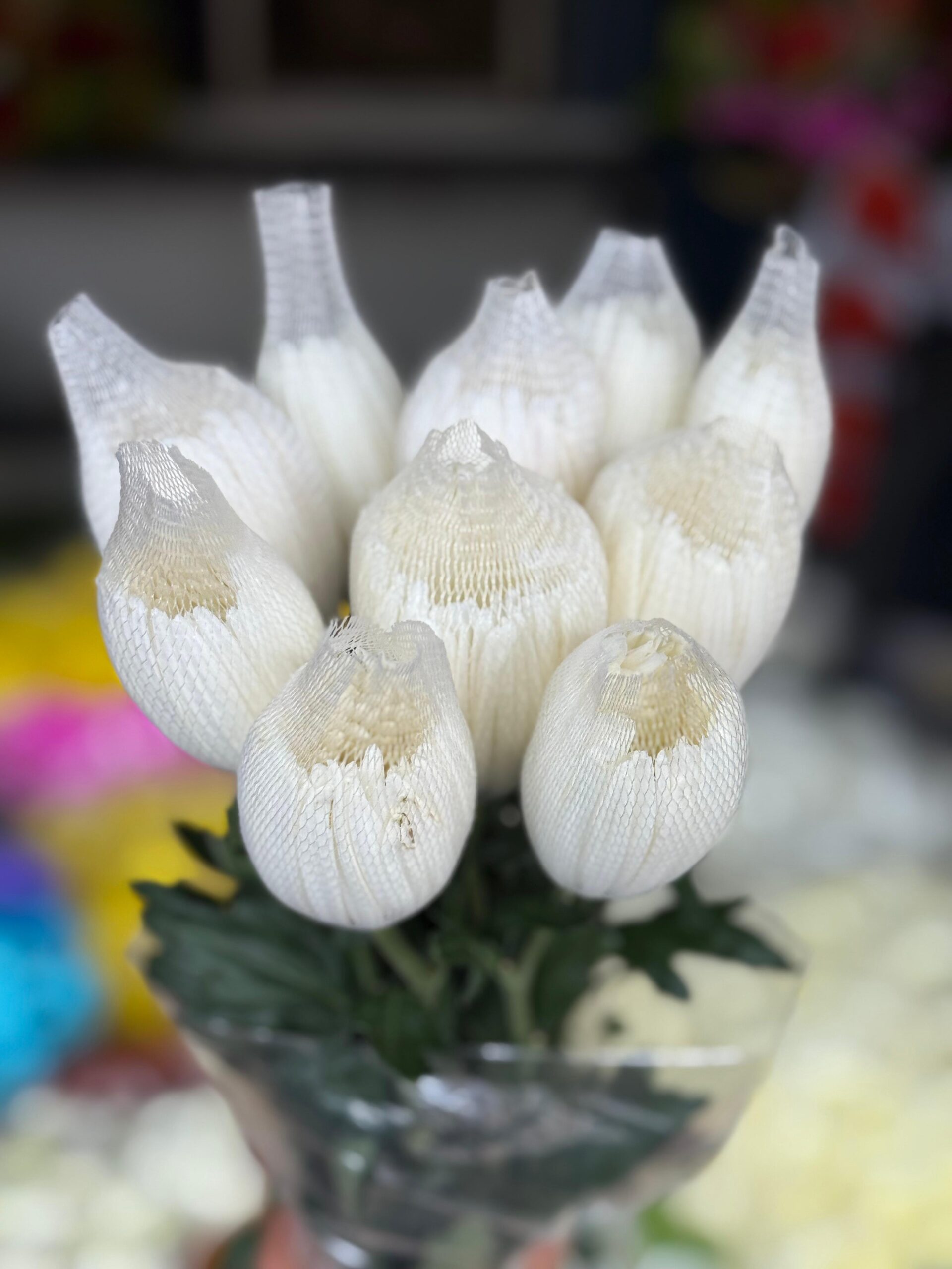 El Crisantemo (o “flor de oro” en su traducción literal) se transforma en una esfera de pétalos inmaculados al abrirse, ofreciendo un volumen y una textura que pocos pueden igualar.