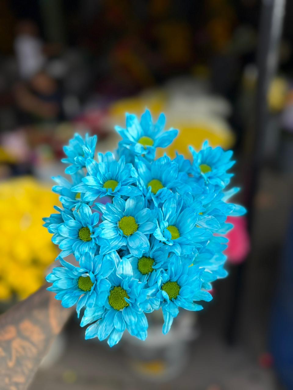El vibrante azul no es un accidente de la naturaleza, es un trabajo artesanal y manual. Cada margarita es cuidadosamente pintada con tintes especiales para flores, asegurando un color duradero y espectacular sin comprometer la frescura de la flor. Este proceso meticuloso garantiza que estás llevando a casa una pieza única de arte floral.