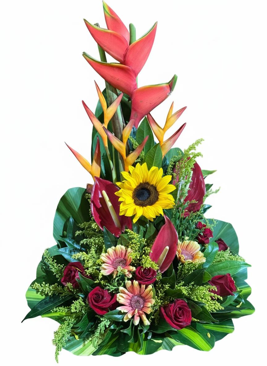 La Altura Tropical (Heliconia): Coronando el arreglo, la imponente Heliconia eleva el diseño, aportando una estatura dramática y un inconfundible aire exótico, como una ave del paraíso que observa el conjunto.