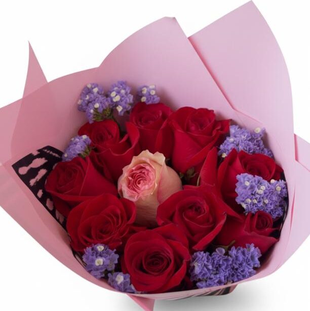 Déjate envolver por la pasión de nueve Rosas Rojas, cada una de ellas un símbolo de amor profundo, respeto y deseo inquebrantable. En el centro de esta ardiente belleza, emerge con delicadeza una Rosa Rosada, que aporta un toque de dulzura, gracia y gratitud, creando un contraste visual que atrae y enamora.
